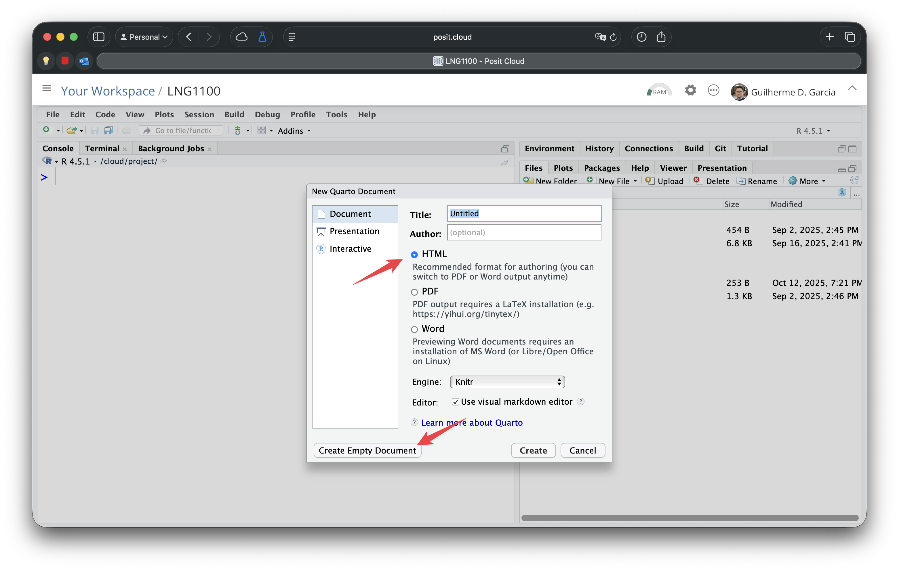 Pour créer votre premier document Quarto, cliquez sur File > New File > Quarto Document... et cliquer sur Create Empty Document. Finalement, enregistrer votre ficher Quarto, dont l’extension sera toujours .Qmd. Il est peut-être une bonne idée de l’enregistrer dans un dossier spécifique pour ce genre de documents. Dans notre projet, vous trouverez un modèle dans le dossier quarto.